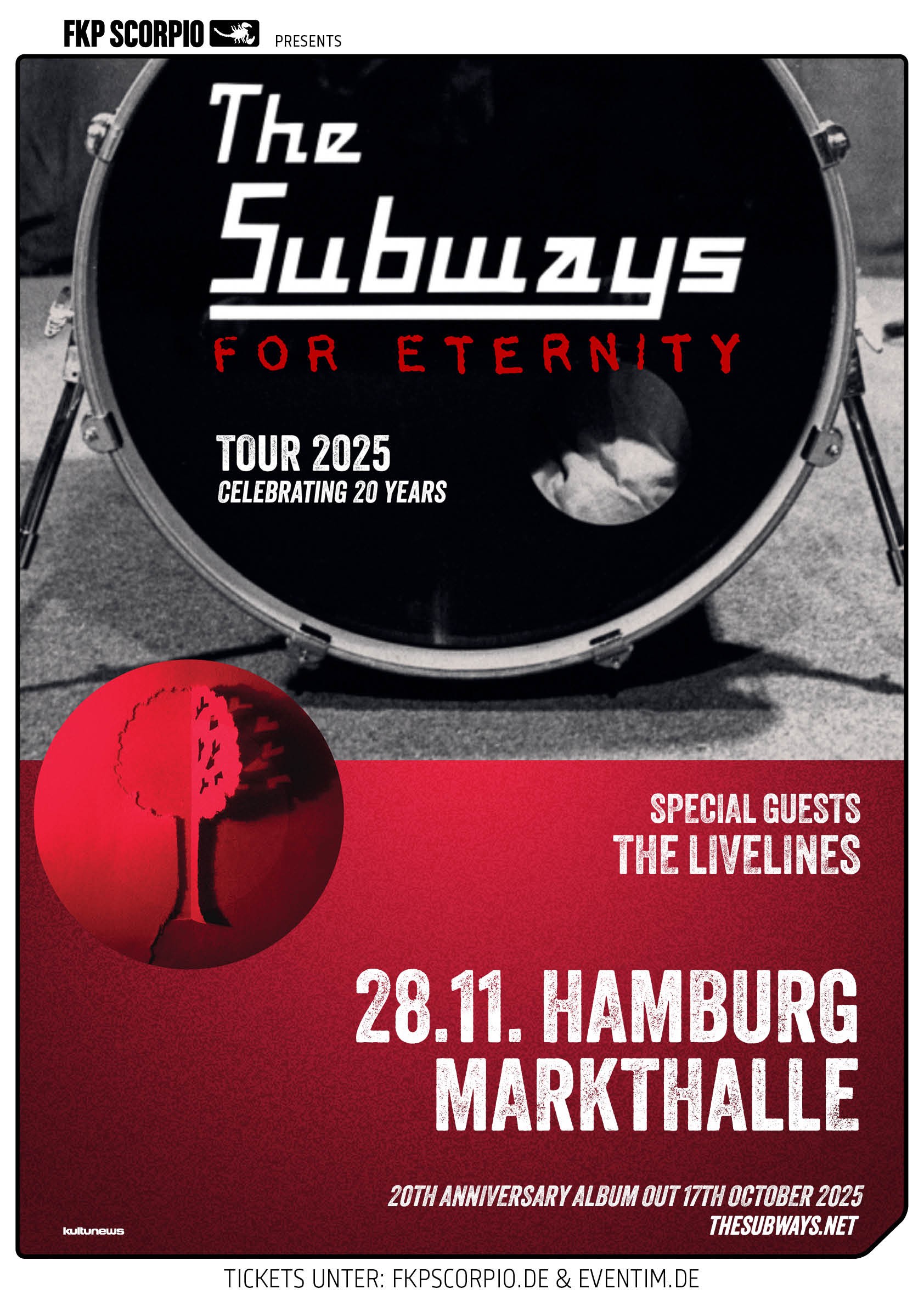 Seit zwei Jahrzehnten gehören The Subways zu den energiegeladensten Indie-Rock-Bands Europas. Im Oktober kommen sie für zwei exklusive Album-Release-Shows nach Deutschland. Gegründet 2005 in England, haben sie mit Songs wie „Oh Yeah“, der Rockhymne „Rock & Roll Queen“ oder „We Don’t Need Money To Have A Good Time“ unzählige Festivalbühnen erobert und sich über die Jahre eine treue Fangemeinde aufgebaut, die ihre energiegeladenen Live-Auftritte seit jeher zu schätzen weiß. Dabei haben The Subways nicht nur musikalisch überzeugt, sondern mit ihrem unverwechselbaren britischen Charme und ihrer rohen Bühnenpräsenz stets eine mitreißende Performance geliefert, die Fans jeden Alters begeistert. Zum Jubiläum erscheint am 17. Oktober 2025 ihr neues Album „When I’m With You“. Die Platte fasst die bisherige Bandgeschichte eindrucksvoll zusammen, bringt die größten Fan-Favoriten noch einmal in Erinnerung – und zeigt zugleich mit frischem Material, dass The Subways nach 20 Jahren nichts von ihrer kreativen Kraft verloren haben.